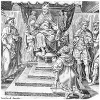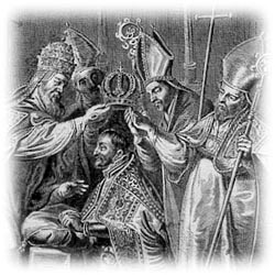 Op 24 februari 1530 wordt Karel V ook door de kerk officieel tot Rooms Keizer gekroond. Paus Clemens VII overhandigt Keizer Karel, 30 jaar en zowel uiterlijk als innerlijk een volwassen man geworden, de rijkssymbolen, de scepter, het zwaard en de rijksappel.Historische achtergrond